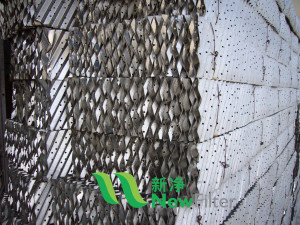 产品简介: 孔板波纹填料是在金属薄板表面冲孔、轧制密纹,冲波纹最后组装而成的规整填料, 具有阻力小、气液分布均匀、效率高、通量大、放大效应不明显等特点,应用于负压、常压和加压操作。 Structured Packing Mellapak